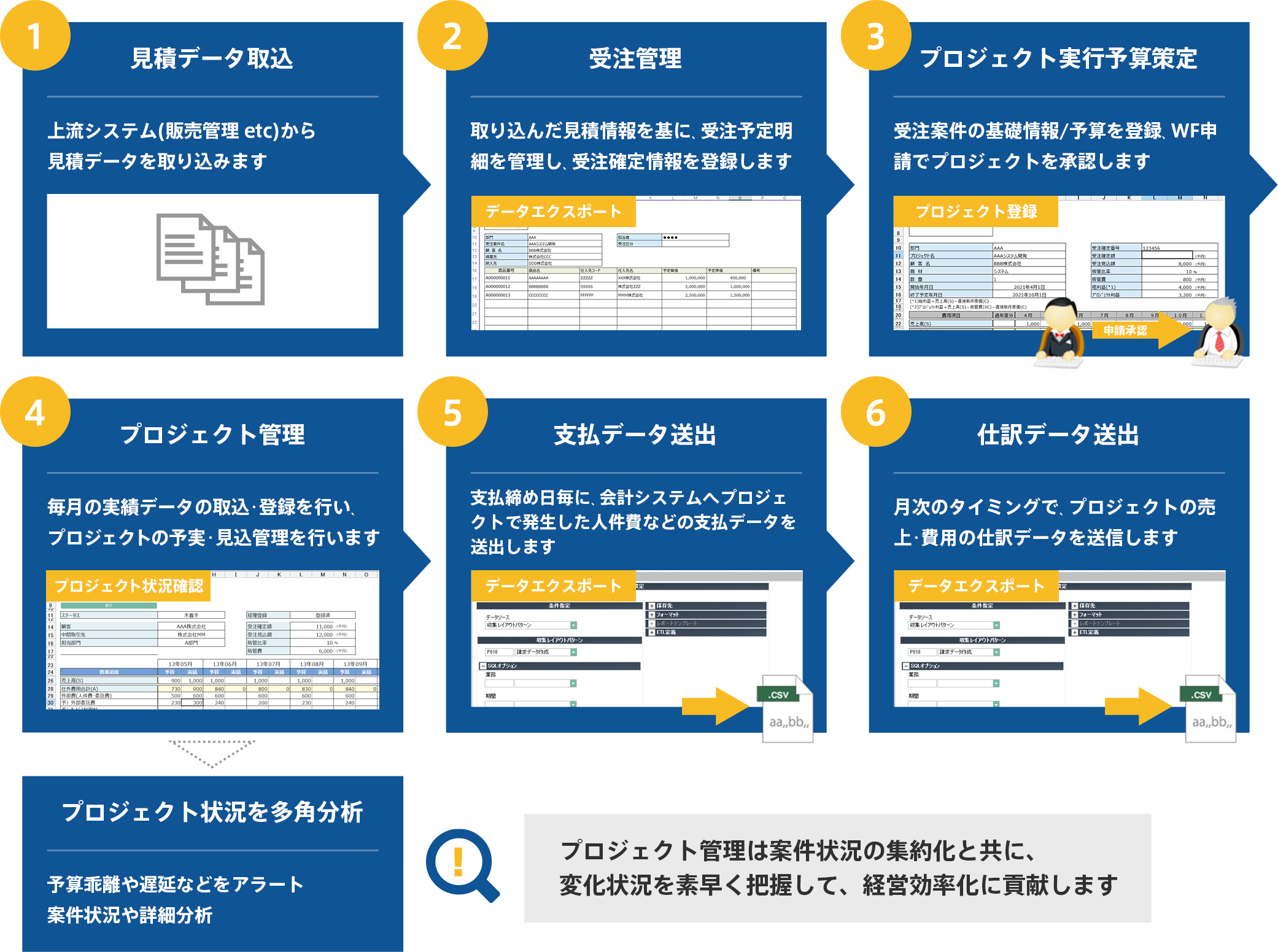 BBS提供のテンプレートを連携する事で、プロジェクト管理から会計まで統一が可能となり、短期導入で大きな経営効果を得られます。
